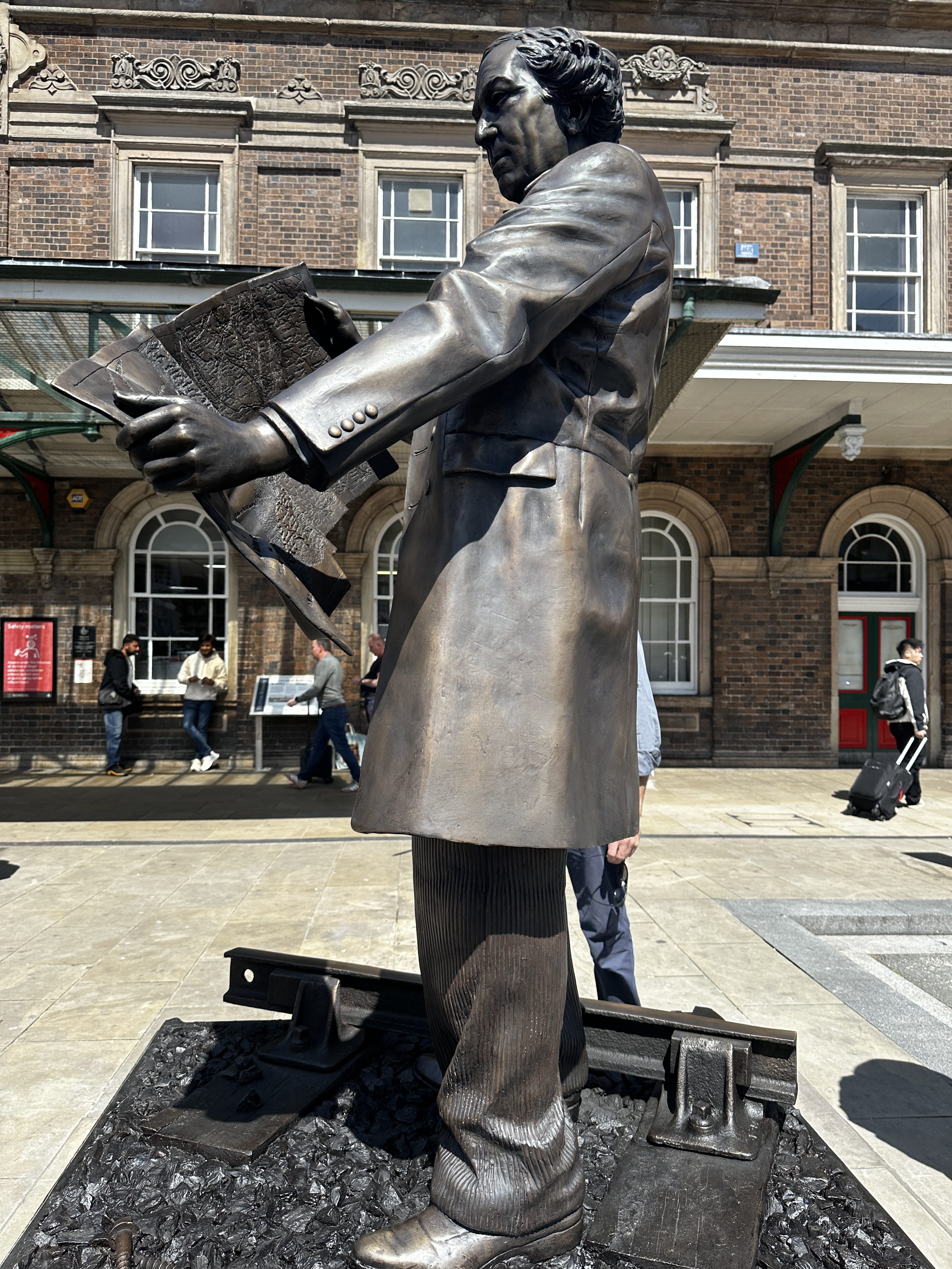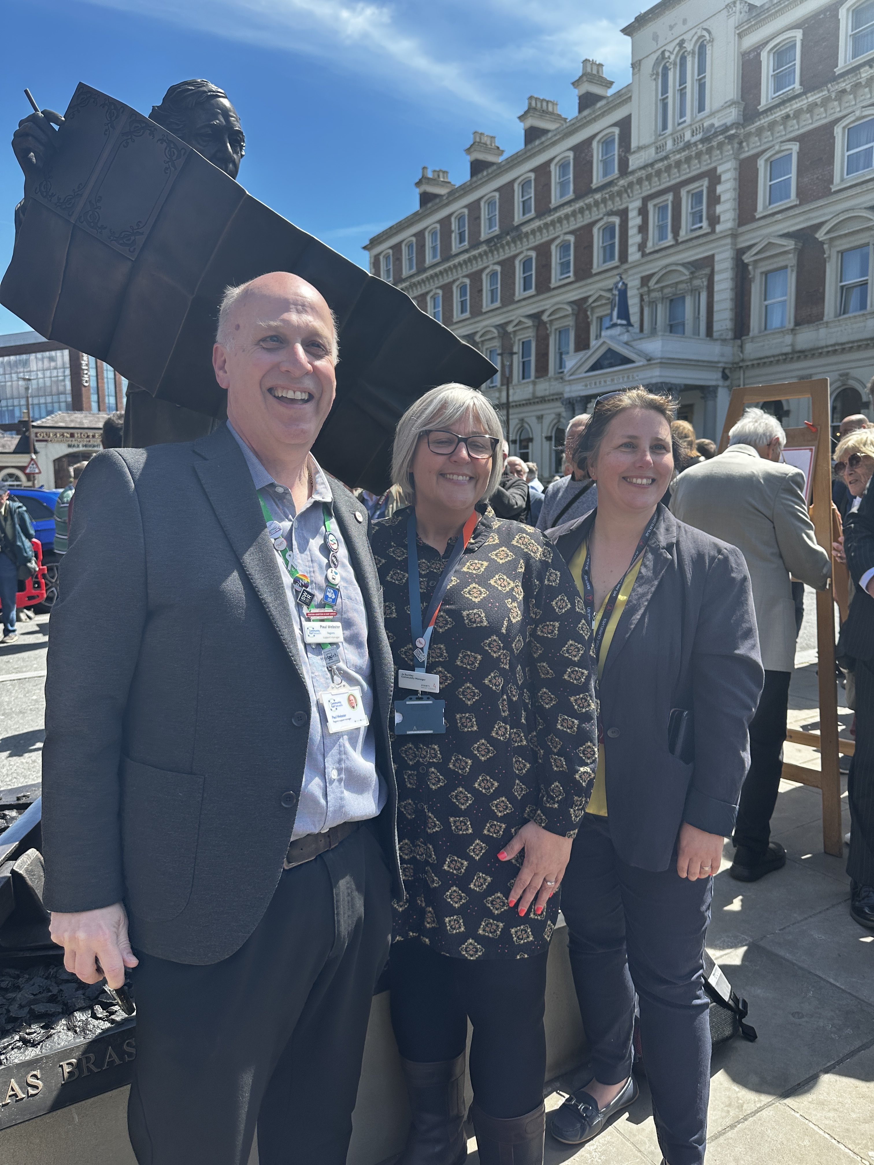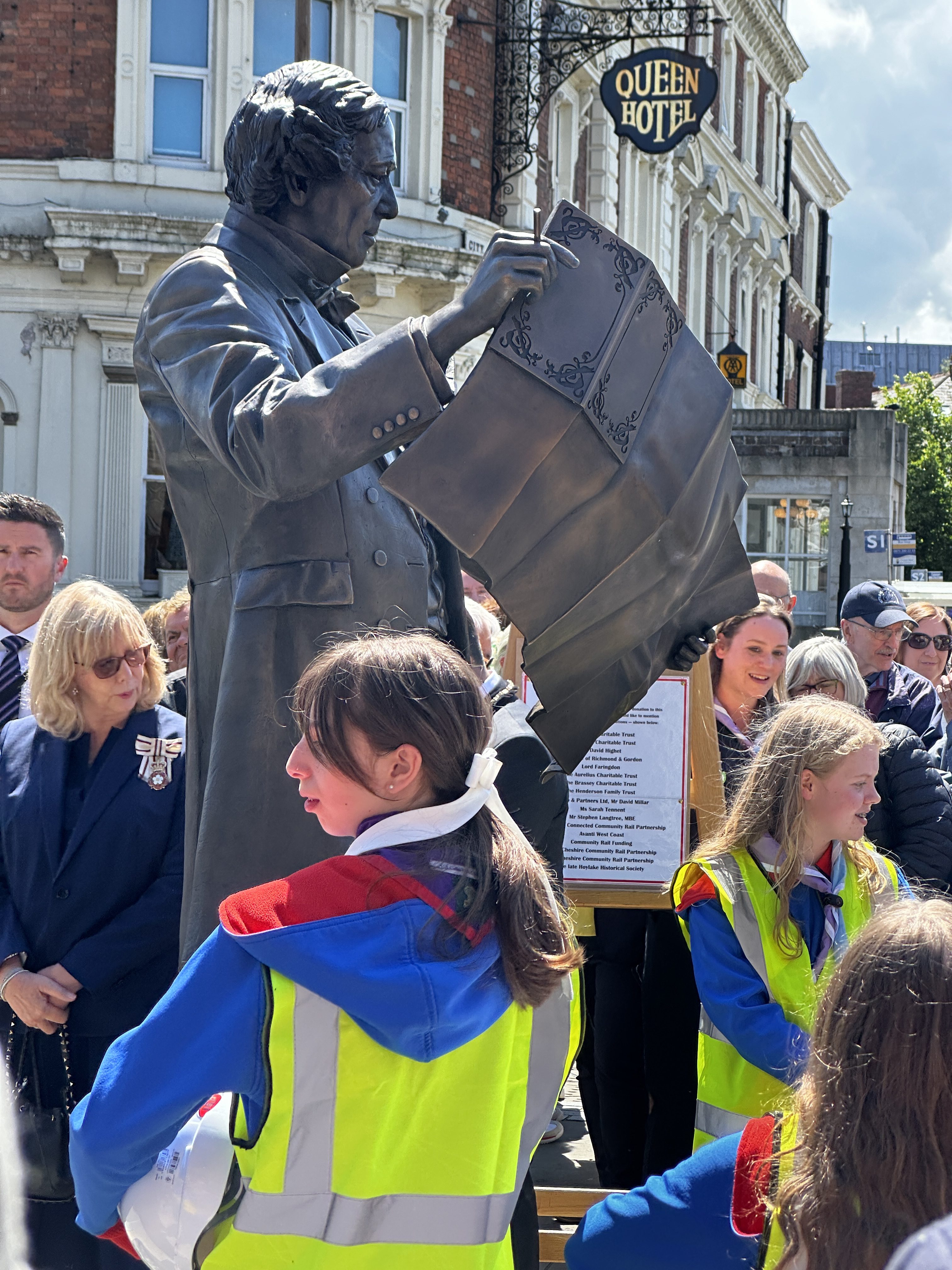 Amser y cerflun dadorchuddio gyda'r dathliadau deucanmlwyddiant y DU rheilffyrdd.